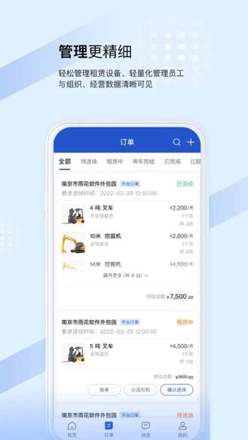 通过一站式服务可实现工程设备管理、项目账单管理、金融回款管理、内部人员管理等全周期成长。