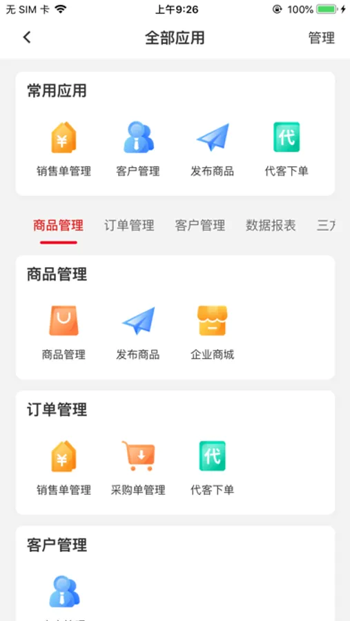 数据报表:交易可视化数据表单,包含客户订货、商品销售、地区统计、员工拉新、员工销售报表,经营数据一目了然。