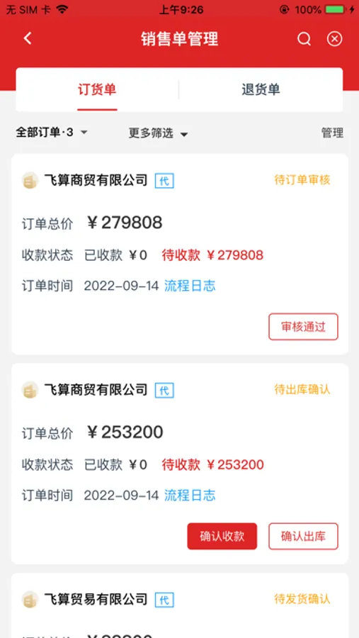 订单管理:交易订单全流程服务,包含在线选品、订单审核、出库发货、收货收款等功能,订单流程灵活设置,简单明了,效率倍增。