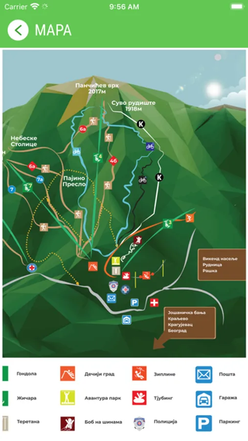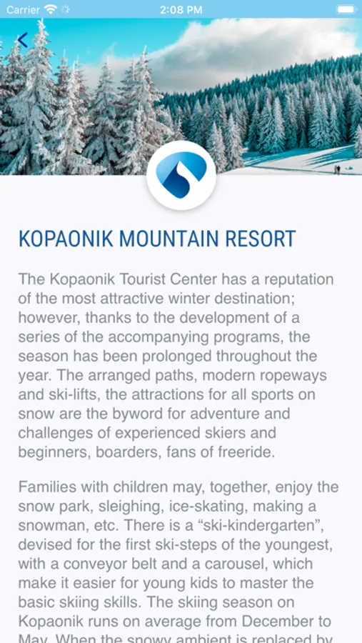 The official application of the Public Enterprise "Ski Resorts of Serbia" is intended to be used by the visitors of the ski centers Kopaonik, Tornik and Stara planina. With this application, visitors will be able to get all relevant information in a simple, fast and attractive way so they can enjoy their vacation.