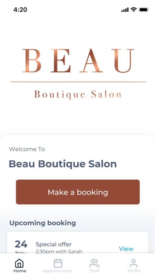The Beau Boutique Salon app makes booking your appointments and managing your loyalty points even easier. You're just a few taps away from feeling good and looking great!