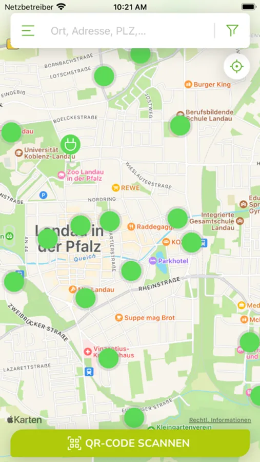 • Listendarstellung von Ladestationen im Umkreis mit einstellbarem Suchradius
