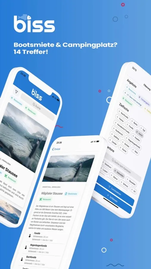 Du bist es leid, dir die Infos für dein nächstes Fischereierlebnis mühsam im Internet zusammenzutragen? Unsere App schafft Abhilfe! Filtere über 50 Seen der Schweiz nach Eigenschaften wie «Bootsmiete», «Restaurant», «Kanton» und vielem mehr. Wir zeigen dir auch gleich, wie du anreisen und wo du ein Patent beziehen kannst.