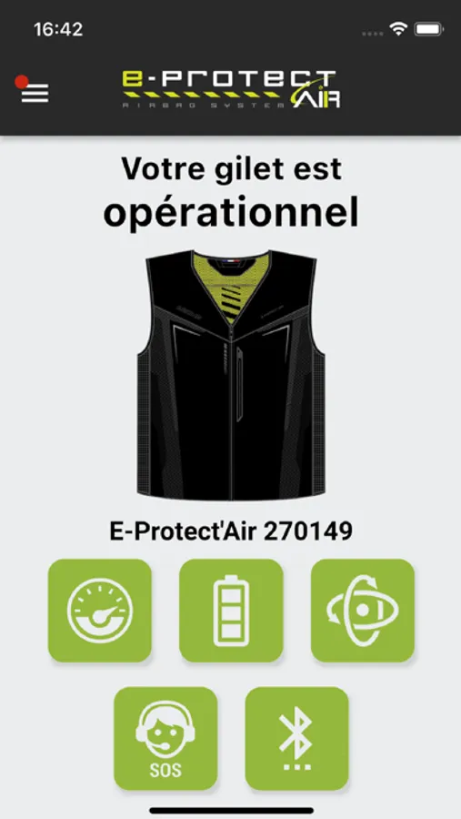 Cette application est liée au produit Eprotect air de la marque BERING. Ce produit est un airbag électronique pour l’usage de la moto sur route. Cette application permet de vérifier l’état de fonctionnement du gilet airbag Eprotect air. En cas de déclenchement de l’airbag, l’application met en relation l’utilisateur avec les services d’urgences.