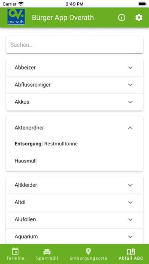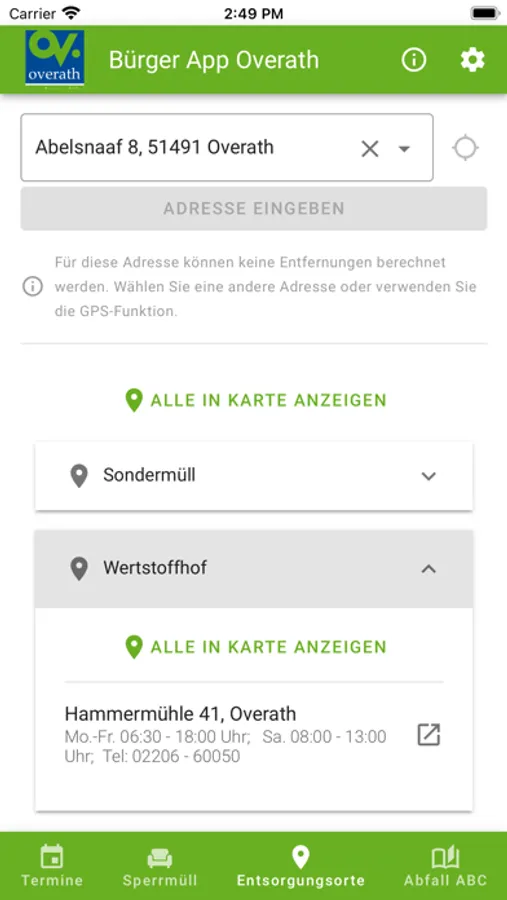 Sie können die Standorte und Öffnungszeiten der umliegenden Container und Wertstoffhöfe anzeigen lassen. Haben Sie den passenden Entsorgungsort gefunden navigiert Sie die App bequem von Ihrem aktuellen Standort. In der App können Sie sich außerdem über die Entsorgungsvorschriften Ihrer Stadt bzw. Kommune informieren (Abfall ABC).