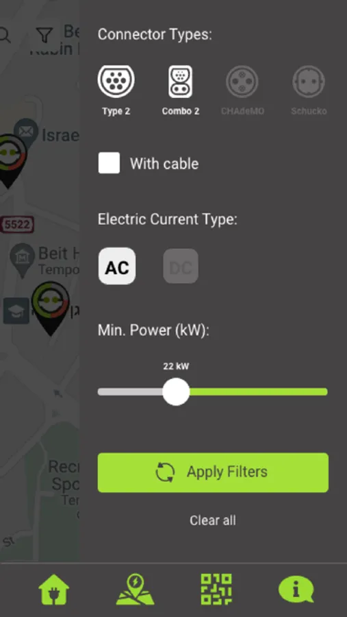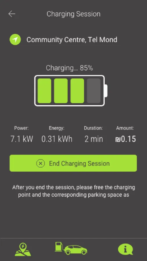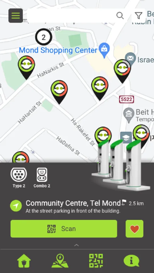 The widget shows the availability and location of chargers in Israel and allows navigation to the selected charger through the navigation app installed on your phone. The app allows: to start and stop charging, manage the payment method, see the charging history and order the use of the charger in advance.