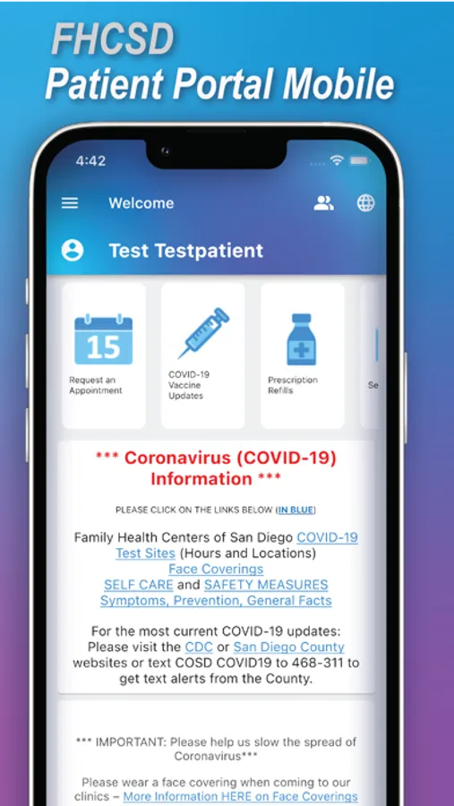 FHCSD Patient Portal is a mobile app that provides patients personalized and convenient 24-hour access to portions of their Family Health Centers of San Diego medical records. Please visit MyHealthRecord at: https://ppm.fhcsd.org.