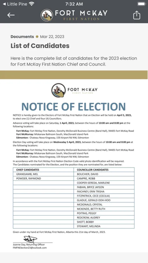 Users can utilize native iOS functionality to quickly and easily add posted events to their device calendar with one tap, as well as receive push notifications. Connect directly to the Band Office — submit requests, information, and questions that will be associated with your user account; make your voice heard! Authorize or reject documents sent by the Band Office, and issue corrections.