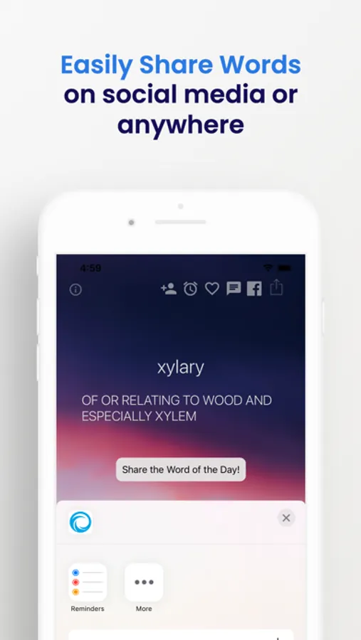 • Post the Word of the Day to Facebook, Twitter, SMS, Instagram, or any other social media app. Let's fill social media with amazing and interesting words!