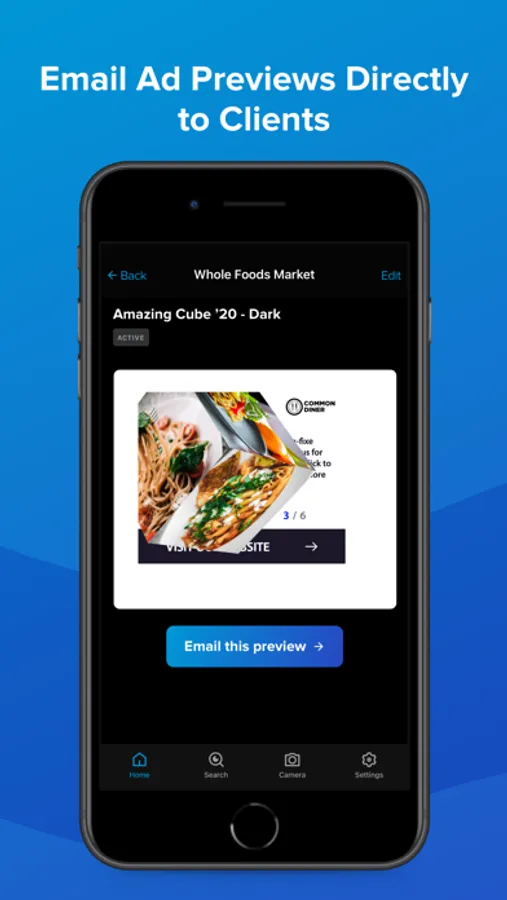* Take photos and upload photos from your camera roll to an advertiser's media gallery