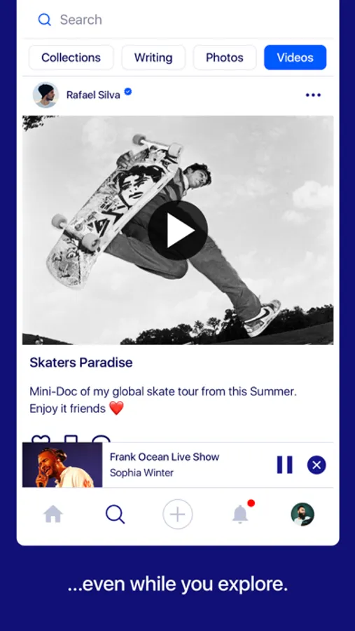 Choose to make singular posts or create collections of content. Collections can be thought of as photo albums, or even a video series of you cooking your favorite dishes. Got a music album or playlist you want to share? Make it a collection. What about a daily or weekly news podcast? Make it a collection (video and audio). Enjoy writing? You can make collections of articles, poems or stories. It's truly what you make it.