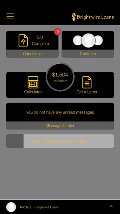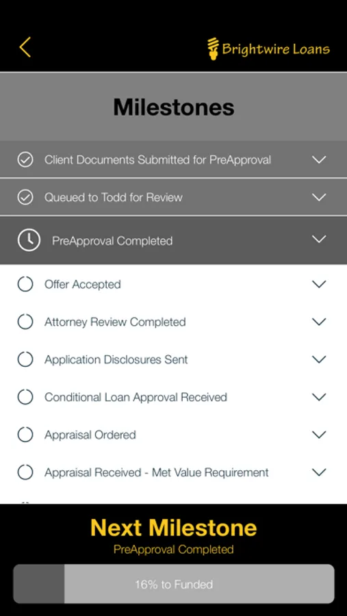 The Brightwire Loans app allows all 3 parties (home buyer, loan officer, real estate agent) to track the progress of the home loan application process as the Home Buyer meets the milestones and conditions required to get final approval.