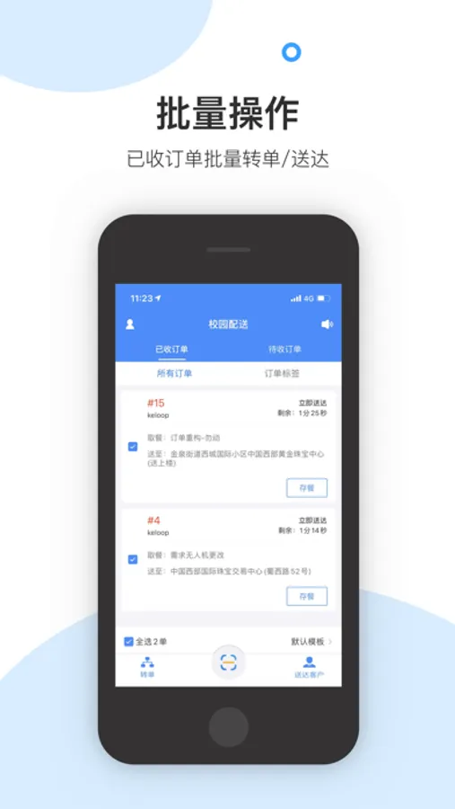 配送员收单后送往中转站,可批量转单给下一程负责的配送员;送达至顾客,可批量送达订单
