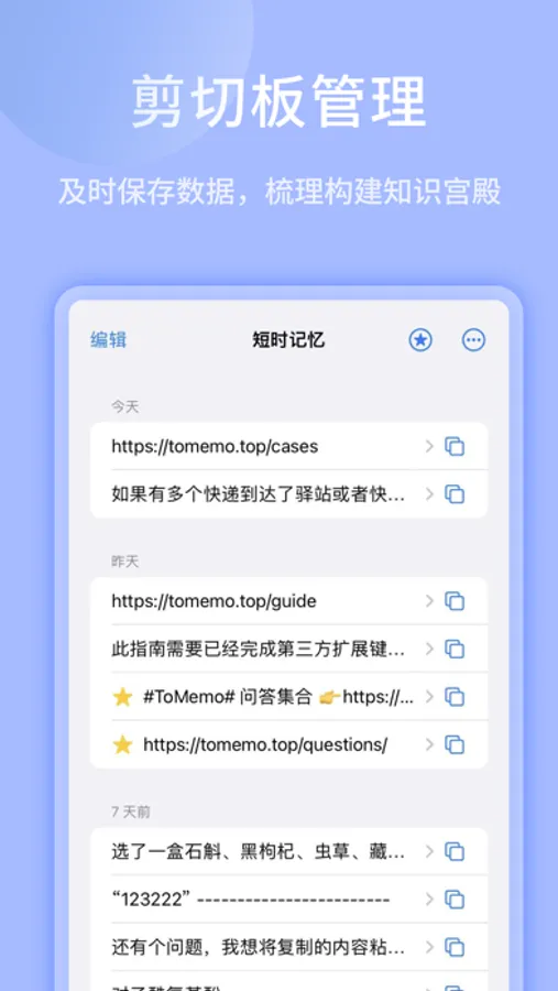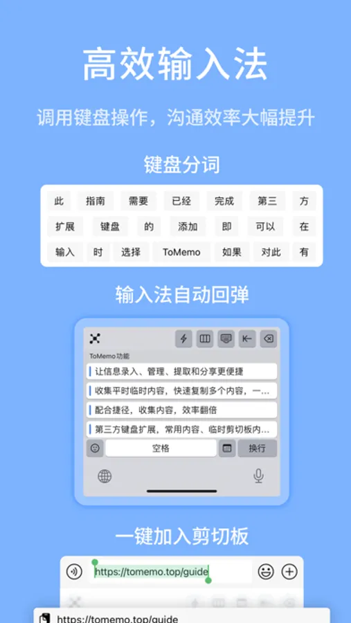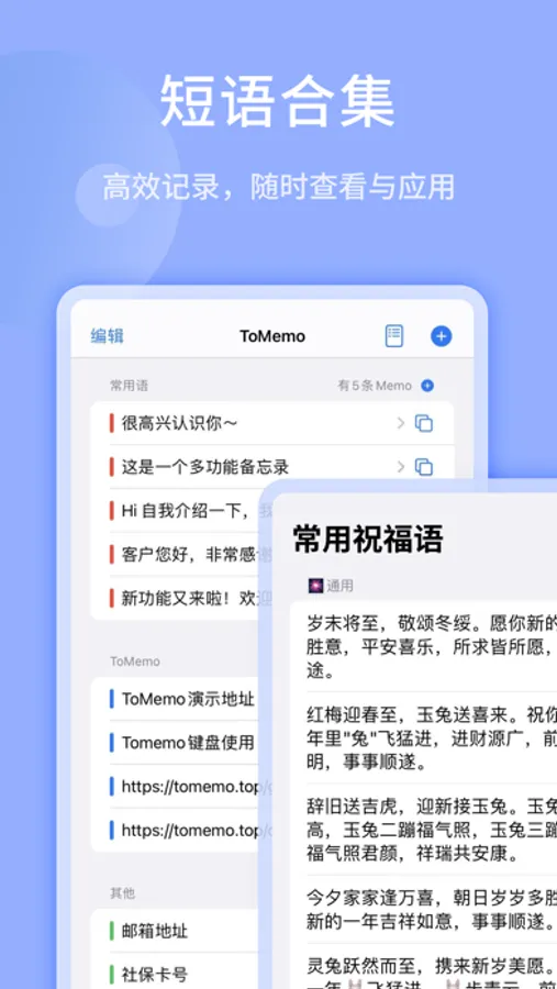 ToMemo,一款超好用的集合多功能快捷键盘的内容收纳工具,可以帮你快速输入常用信息,随手剪贴需要的临时片段,让你在多种场合实现一键发送,大幅提升沟通效率。