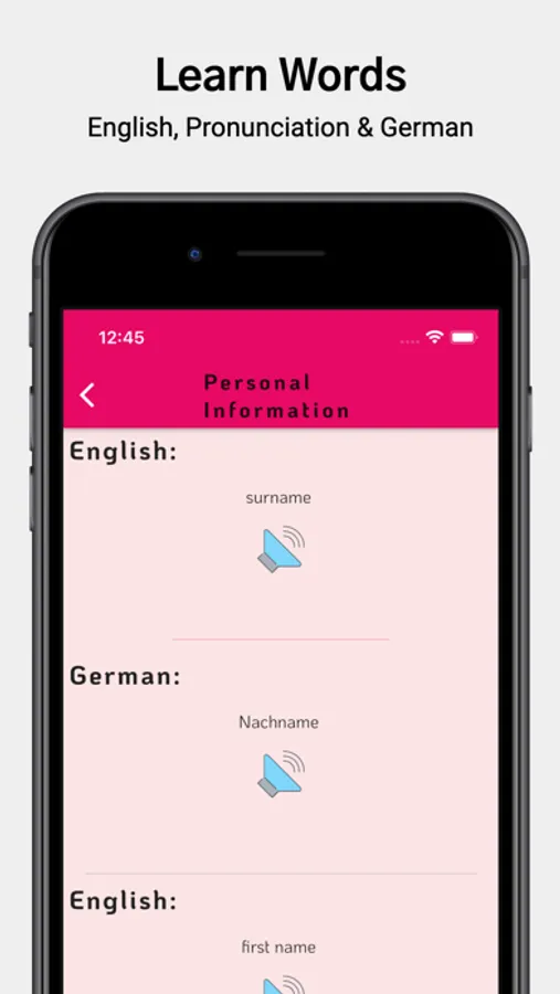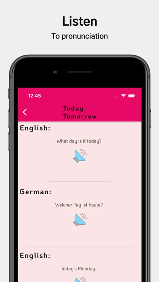 • In every lesson, you can listen to the German word pronunciation as well as see German word in english language.