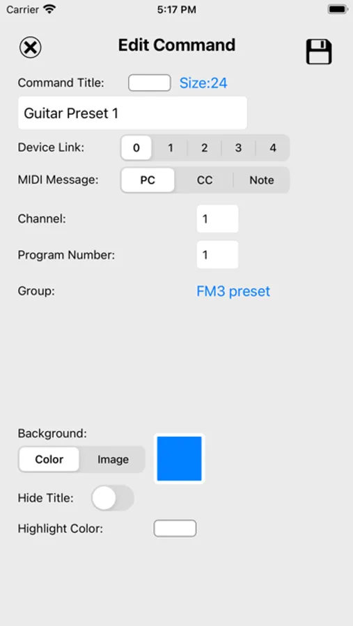 - Support MIDI commands: PC (Program Change), CC (Control Change), Note.
