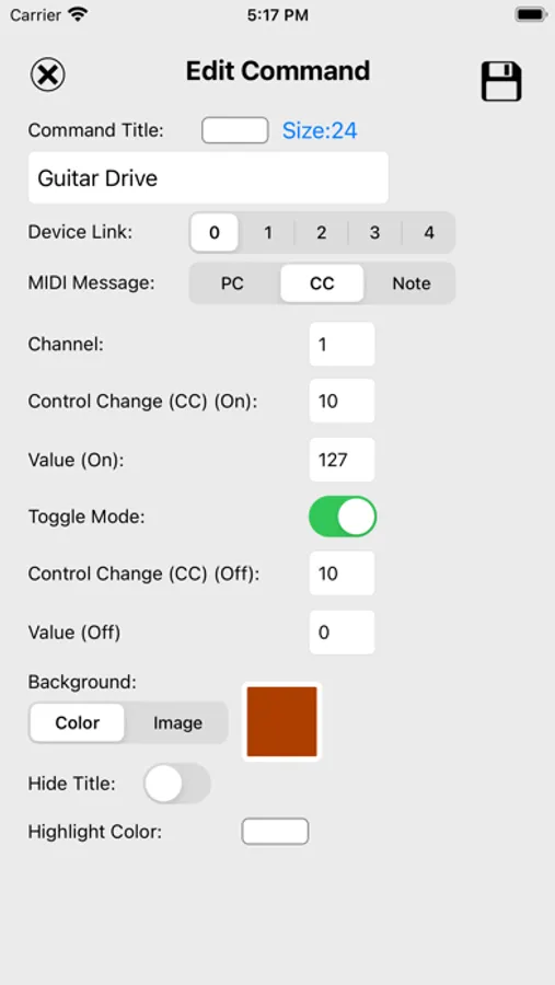 - CC toggle mode: enable CC command with toggle on/off (Two different CC commands) .
