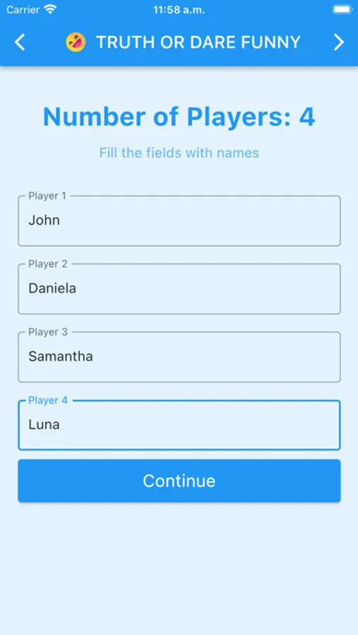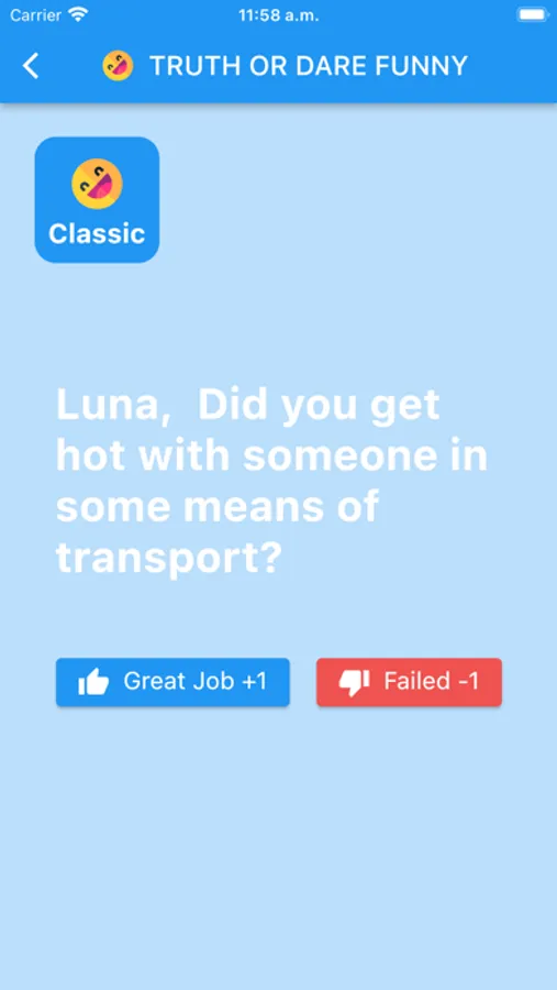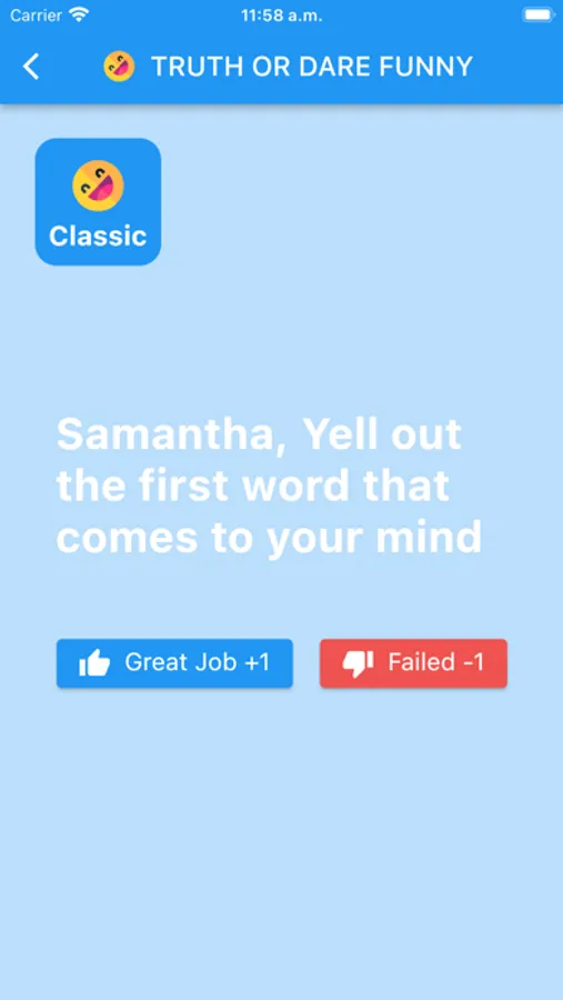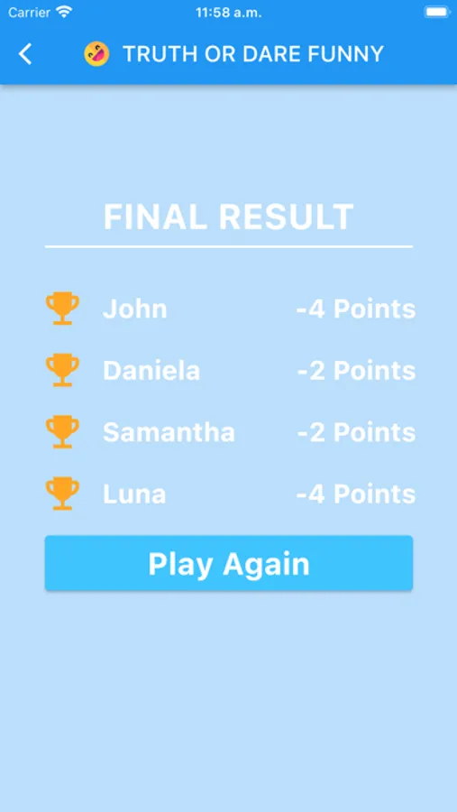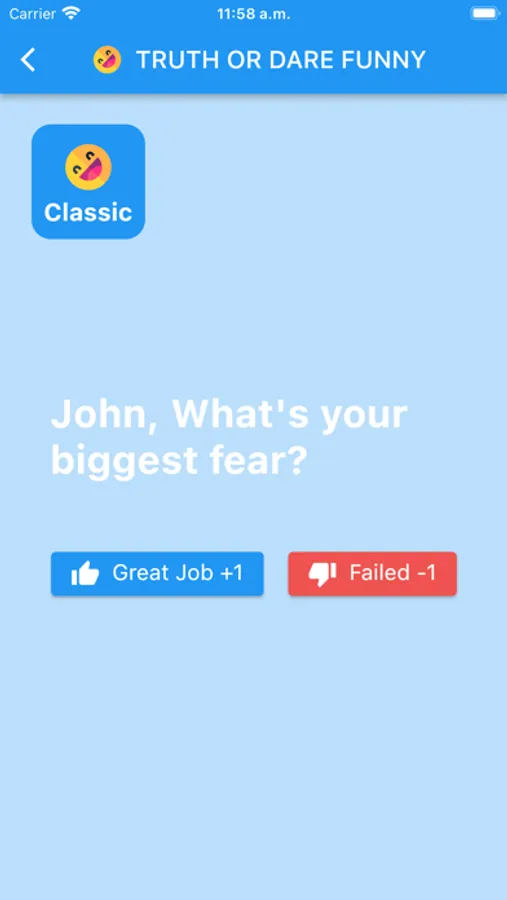 Also contains a points system so every truth or dare all the players should evaluate if the main player did a great job with their answers and dares or made a big fail! If did a good job gets 1 point if fails -1 point. At the end of the game you will see the final result with all the player scores!