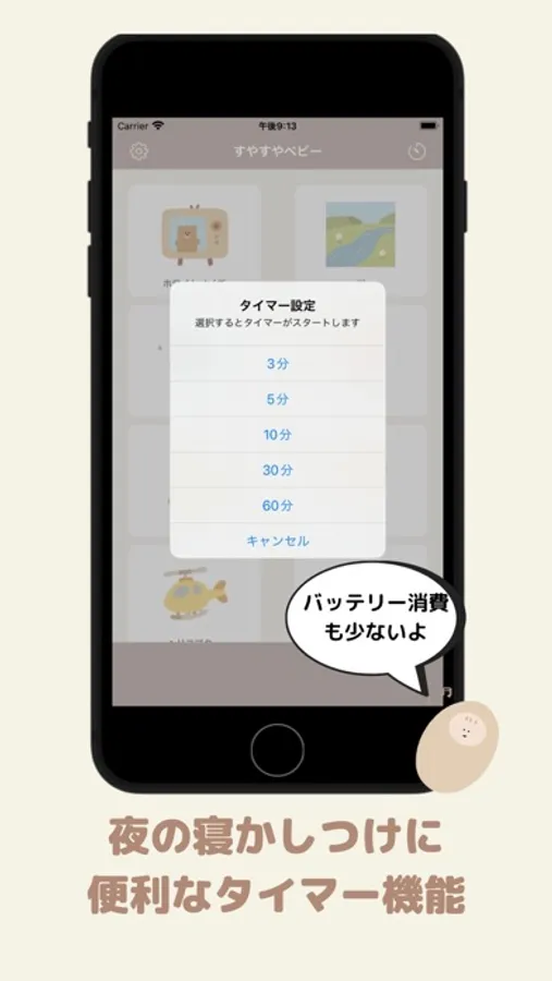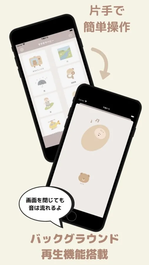 ・ボタンにタッチするだけで泣き止ませに効果のある音声を簡単に再生できます。