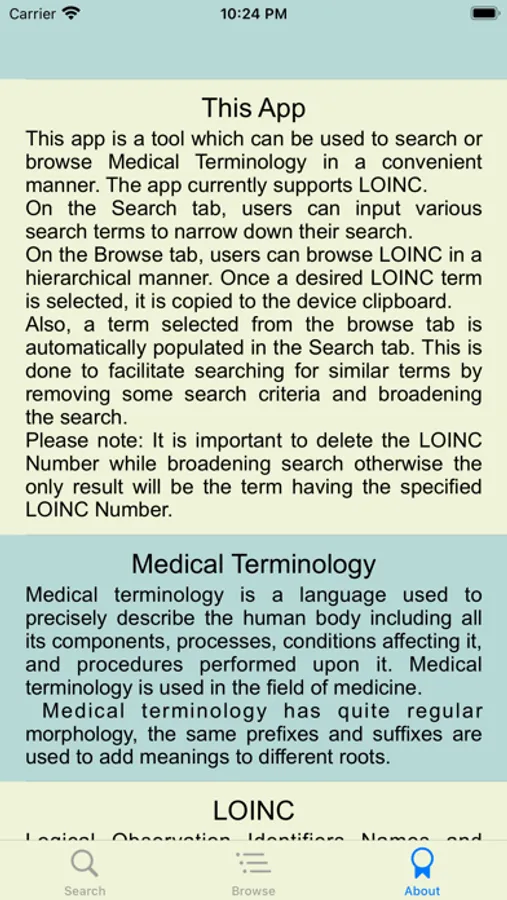 This app is a tool which can be used to search or browse Medical Terminology in a convenient manner. The app currently supports LOINC.