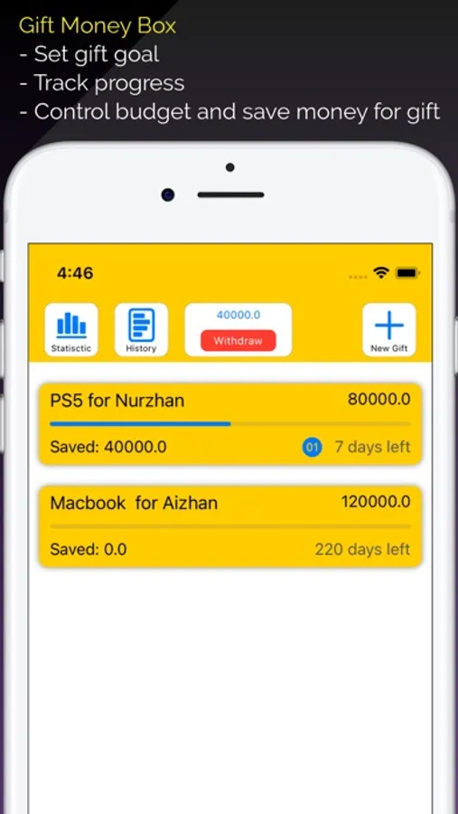 Set a gift goal and track it. Use widget which will always remind you. Control your budget. Make your people happier!