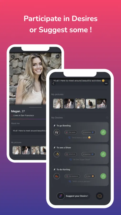 Search for users around you with geolocation and consult their profile. You have the option of joining their Desires or purpose them one.