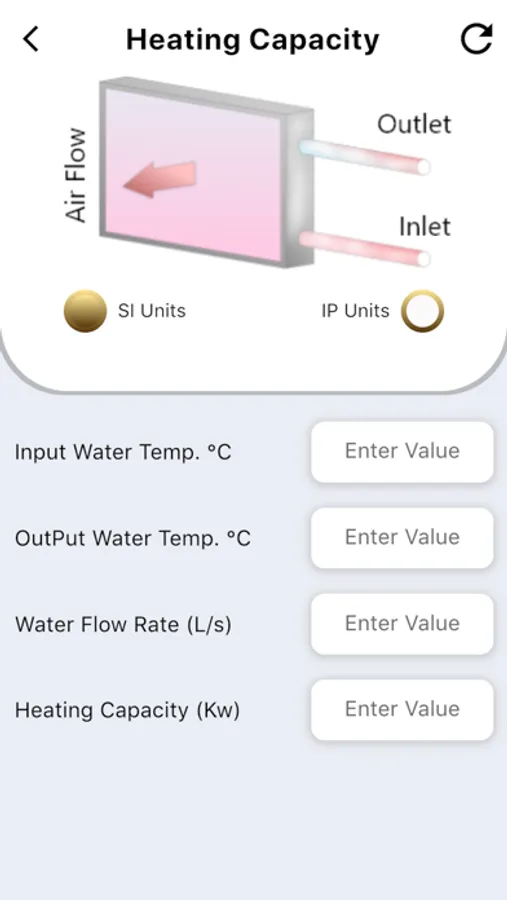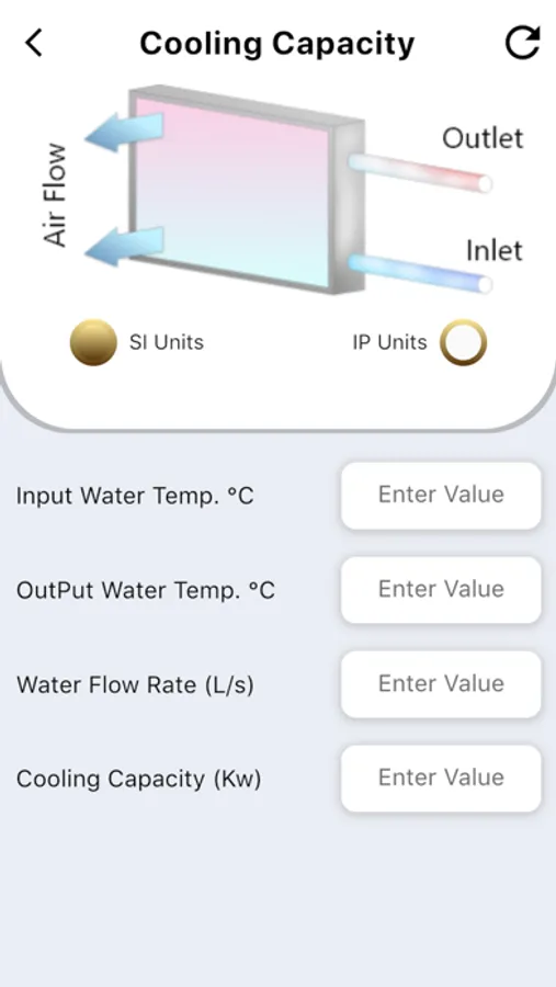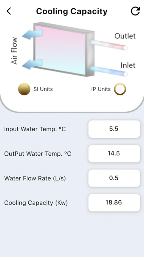Cooling Capacity tool will do the calculation for you for any input values are available for you…for example it can calculate the cooling load capacity if you have (inlet temperature, outlet temperature, & water Flow), also it can calculate water Flow if you have (inlet temperature, outlet temperature, & cooling capacity)…