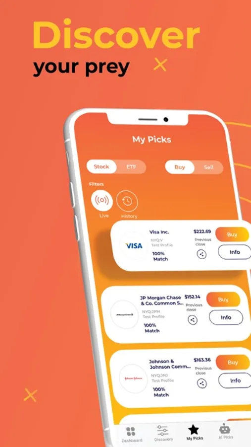 Once you have created your discovery profile(s), Wolfpack will display the Stock’s and ETF picks that match your profiles selected investment criteria. These will appear daily before markets open within your my picks section.