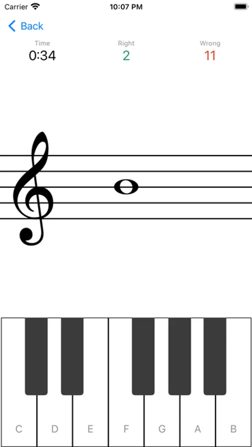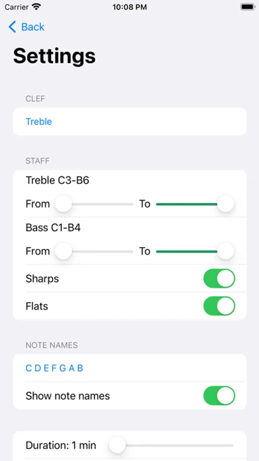 Customize your practice. Choose your treble and bass staff. Set the range of notes on the staff from 6 octaves up, including above and beyond staff, sharps, and flats. Switch between note names. Set the time for the session. Toggle the sound of the note and the pressed key.