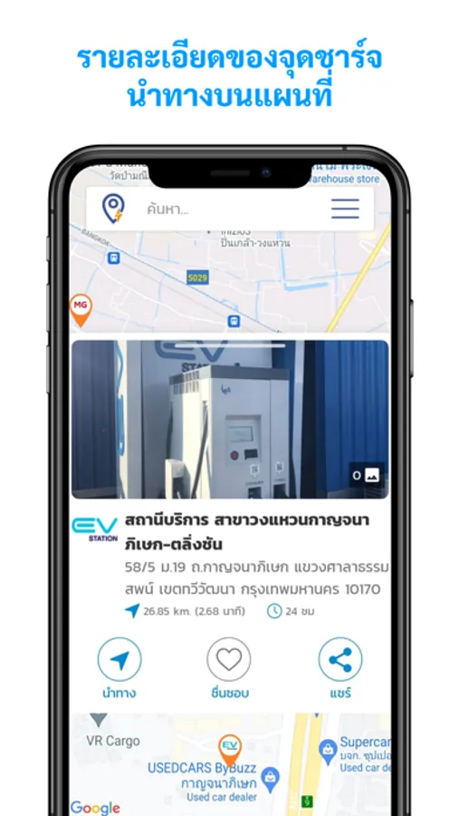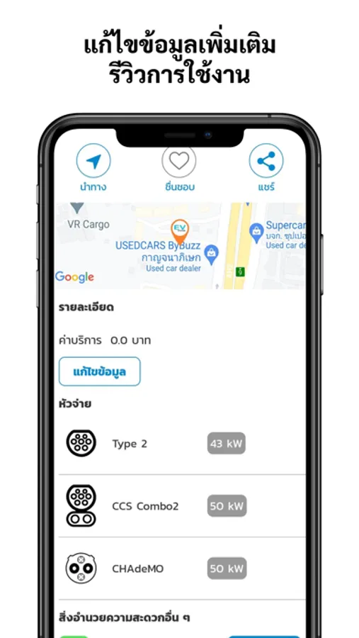 - แสดงตำแหน่งสถานีชาร์จรถยนต์ไฟฟ้าของผู้ให้บริการต่างๆ บนแผนที่ และข้อมูลเบื้องต้น เช่น ชนิดหัวชาร์จแบบชาร์จเร็ว (DC) หรือแบบปกติ (AC) และกำลังไฟฟ้าสูงสุดที่ให้บริการ
