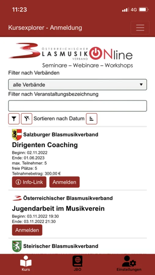 The integration of the seminar portal 'BlasmusikONline' of the Austrian Brass Band Association with a registration function for the respective seminar is available for anonymous access. In the background, these functionalities include the registration monitoring processes, automatic sending of registration confirmations, participation links for online seminars and the sending of participation confirmations by e-mail.