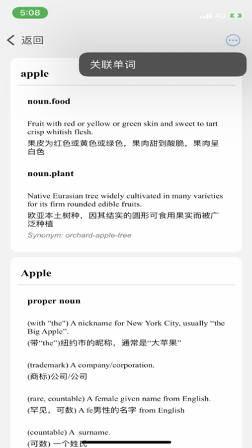 单词详解的更多按钮下可分析单词的关联单词。关联单词不是近义词,而是在 NLP 词空间下的近邻词汇或者说情景相关词汇,比如查询 ‘图表’ 会返回 ‘比例’, ‘统计’, ‘饼图’, ‘折线图’ 等关联词,可方便快捷的提升此场景下词汇能力如 “图表描述场景”