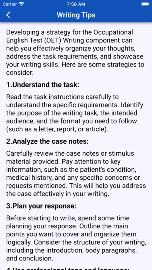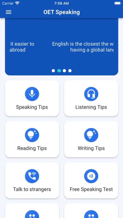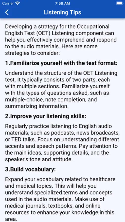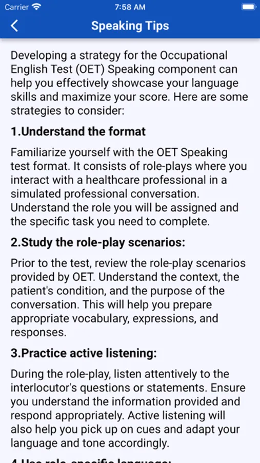 OET is an international test for health care professionals. It has four sections, speaking, listening, writing and reading. This app will help you to improve speaking part. You will get some speaking tips and tricks to have a good score in speaking part. You can find speaking partners and practice with them.