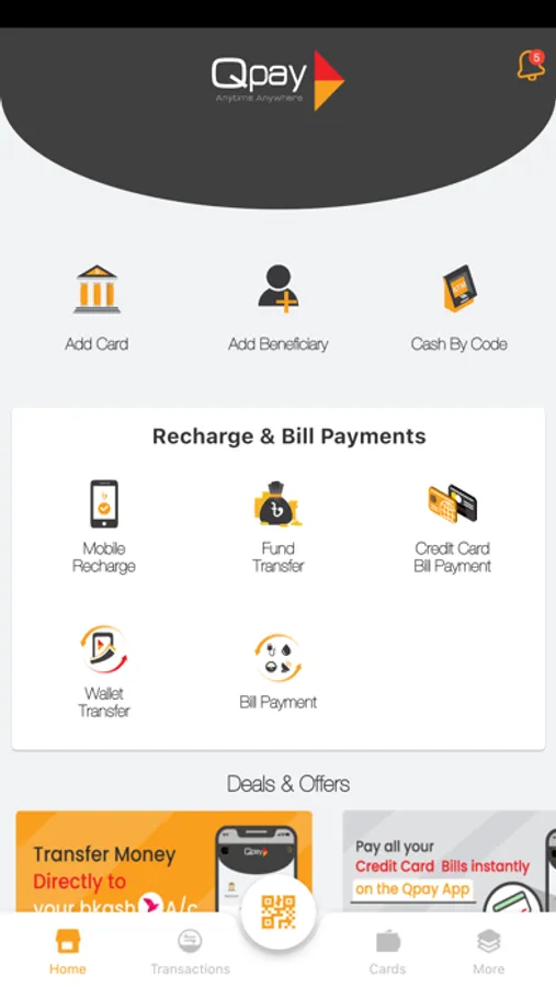 ‘Qpay Bangladesh’ is a revolutionary payment application that enables any bank account, prepaid card, debit card, credit card of Q-Cash member banks to do financial transactions on the go. Using the QPay application, a registered user can do mobile recharge, transfer fund to bank accounts/debit/credit/prepaid cards, pay credit card bills, send money to MFS, withdraw Cash from ATM, pay bills, e.g. Akash DTH bills, make QR payments etc. as long as the cards and accounts belong to a Q-Cash member bank.