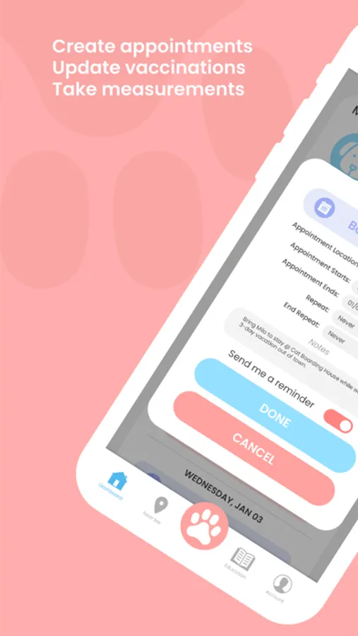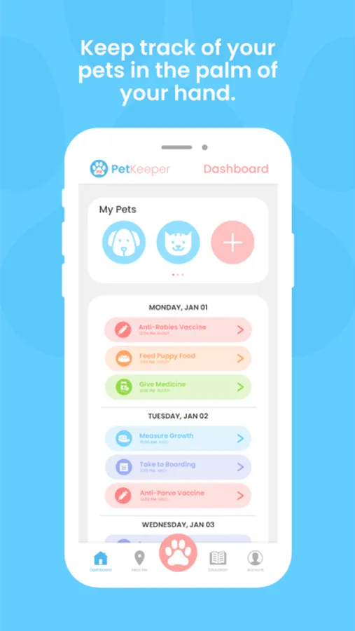 Create appointments, update vaccinations, take measurements and set up feeding and medicine schedules for your beloved pets.