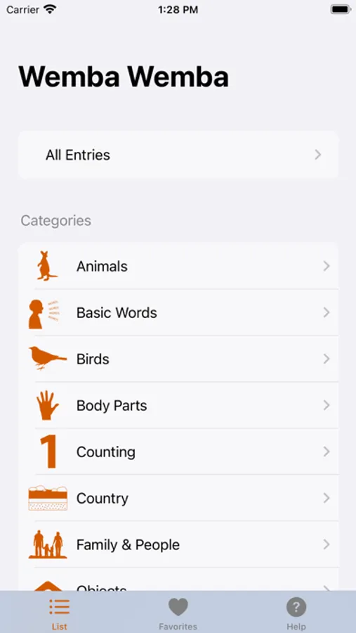 - A variety of categories including body parts, family & people, animals, counting, placenames, birds, objects and more