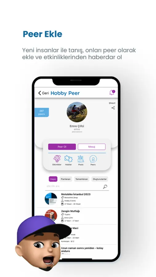 İlgi alanındaki hobilere göre gerçekleşen etkinlikleri bulma, online ya da fiziki olarak gerçekleştirebileceğin etkinlikleri oluşturma ve oluşturduğun etkinliklere "Peer" olduğun kullanıcıları davet etme imkânı sunan Hobby Peer, oluşturulan etkinliklere özel sayfalarda post paylaşarak, yorum yaparak ve beğeniler göndererek ortak ilgi alana sahip olduğun kullanıcılarla etkileşime geçmeni de sağlıyor!