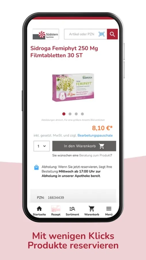 - CLICK AND COLLECT: Reservieren Sie Artikel online und bezahlen Sie bei der Abholung in der Apotheke.