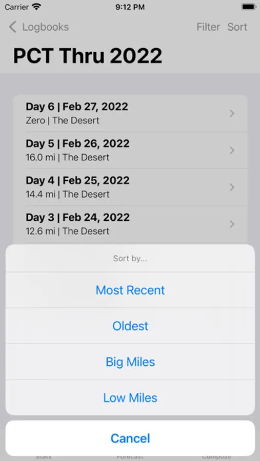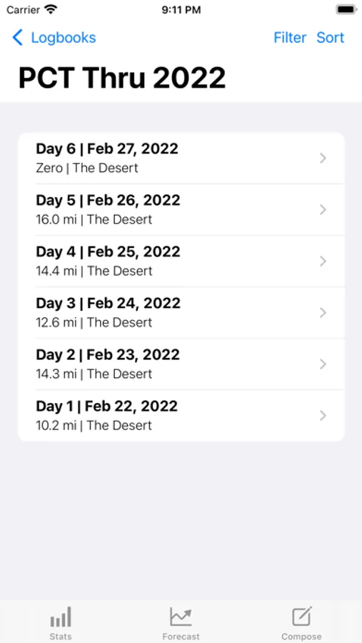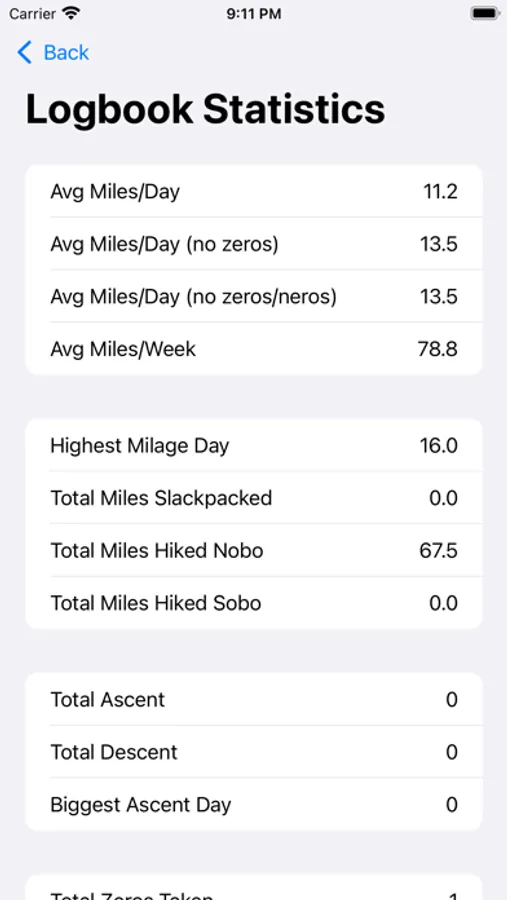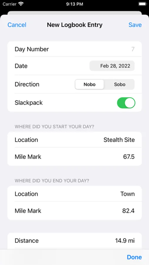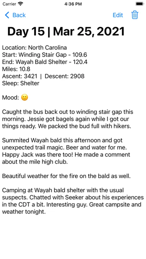 Track all of the details of your long-distance hike with Hiker's Logbook! A journaling app designed by thru-hikers for thru hikers makes your daily log a breeze. Keep your hike on track with the forecast feature, and add custom forecast locations. Ever wonder how many zeros you've taken, how many miles you've slackpacked, your longest no-shower streak, or how many nights you've slept on the ground? Hiker's Logbook presents all of these statistics and more. After your thru is completed, export your entire logbook as a PDF to keep the memories for ever.