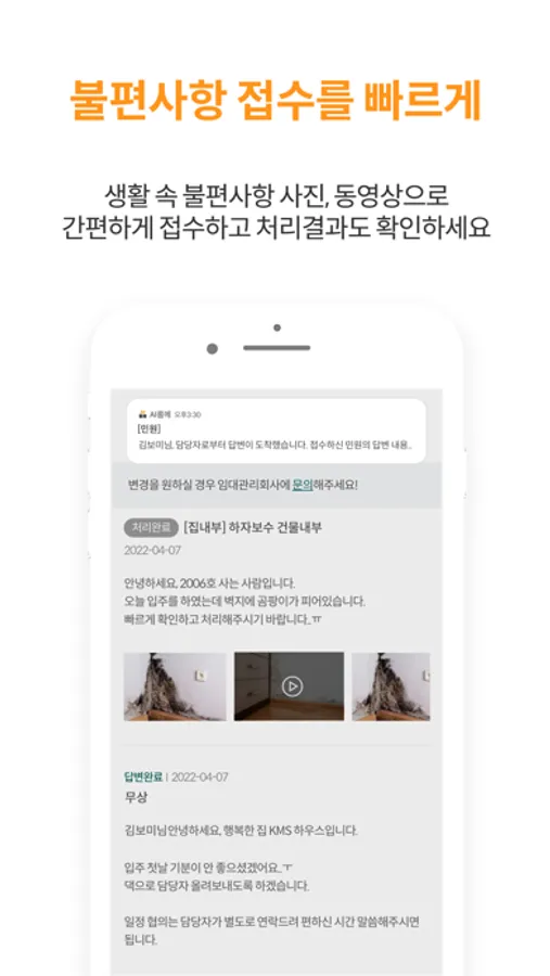 AI룸메와 함께 라면 간편하게 사진과 동영상을 찍어 접수하고 실시간으로 처리 내용을 확인할 수 있습니다.