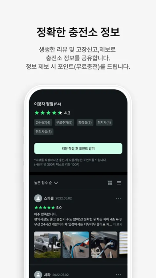 스파클은 유저들의 리뷰 및 고장신고로 충전소 정보를 수집하고 공유합니다.