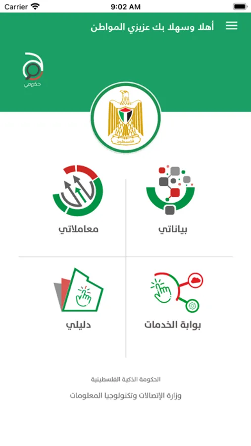تطبيق " حكومي" هو البوابة الموحدة للبيانات والطلبات والمعاملات التي توفرها الحكومة الفلسطينية للمواطنين عبر الانترنت كخدمات استعلامية وكقناة لتقديم طلبات خاصة بمعاملات الدوائر الحكومية.