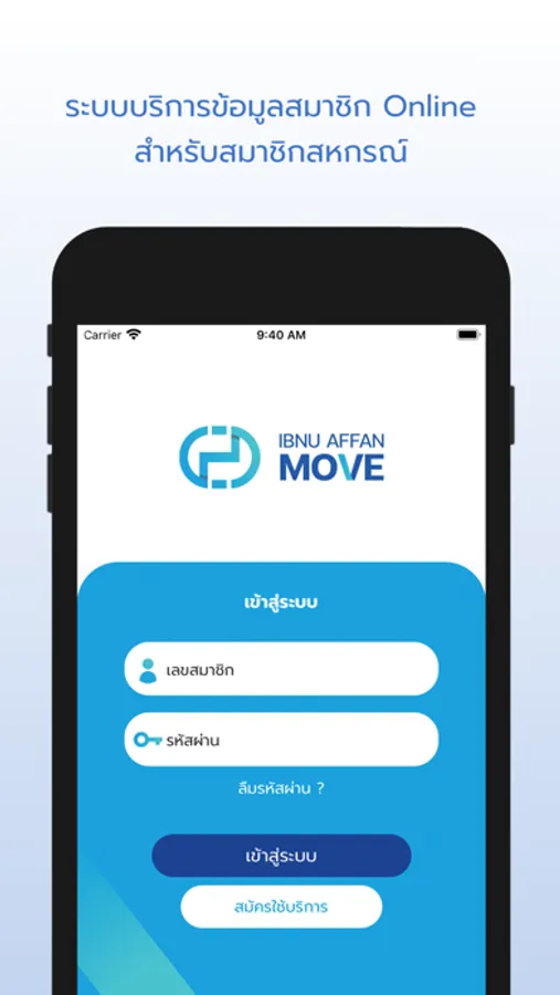 IBNU AFFAN MOVE Application บริการสหกรณ์บนมือถือจากสหกรณ์อิสลามอิบนูอัฟฟาน จำกัด ที่ช่วยให้คุณทำธุรกรรมทางการเงินได้ตลอด 24 ชั่วโมง ก้าวข้ามทุกข้อจำกัด ไม่ต้องรอคิว ไม่ต้องเดินทาง จัดการทุกธุรกรรมของคุณในแอปเดียว