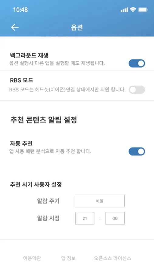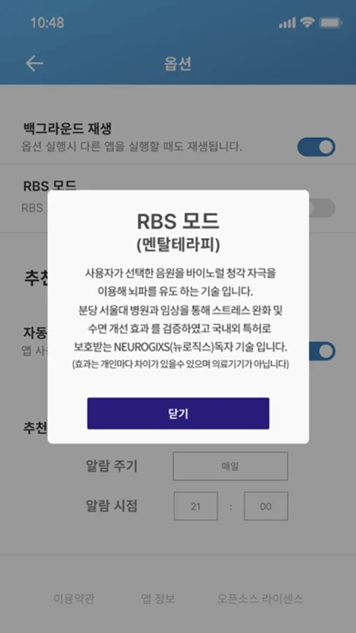 멘탈 테라피를 위해서는 먼저 휴대폰과 보유하고 계신 이어폰 또는 헤드폰이 연결되어야 하며, INFO → 옵션 에서 RBS모드가 활성화 되어 있어야 합니다.