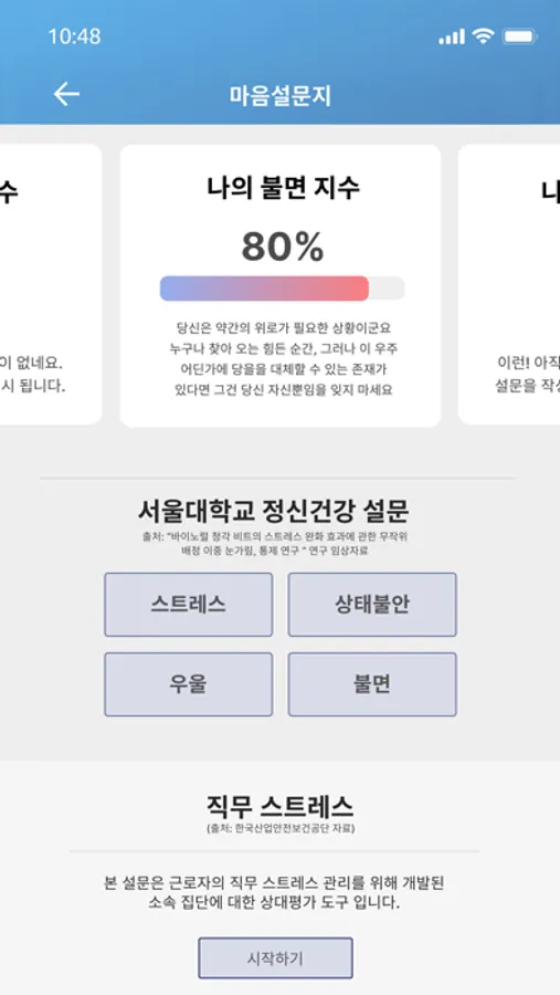 부가적으로 제공되는 스트레스, 우울, 불안, 불면 및 직무스트레스 척도 설문지는 실제 정신건강의학계와 한국산업안정보건공단에서 사용되는 설문지를 이용하며, 설문지를 통해 이용자의 스트레스 상태를 파악 후 그 결과를 수치로서 표출합니다.