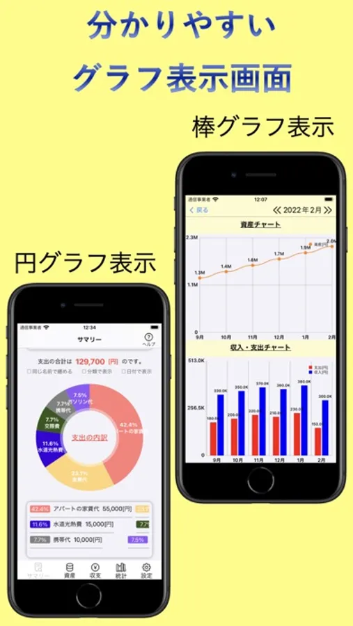 ・入力した資産と収支額をグラフとリスト表示で確認可能