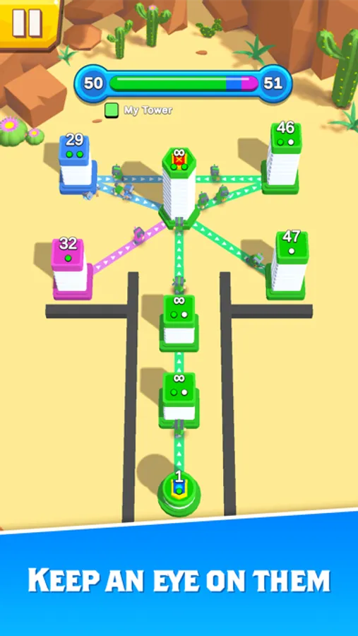- Swipe your finger to draw a line from your tower to others with the target building and increase the number of soldiers.