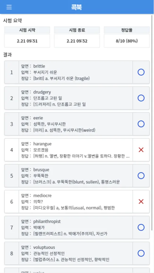각 카드에는 학습 데이터가 축적됩니다. 언제 공부했는지, 얼마나 오래 그리고 자주 공부했는지, 내가 얼마나 어렵다고 평가했는지, 시험에서는 맞았는지 틀렸는지... 이런 정보들이 누적되어 콕북 곳곳에서 활용됩니다.