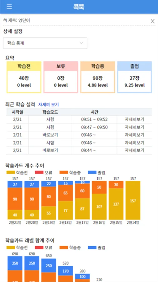 콕북에서는 다양한 학습 통계를 제공합니다. 그 동안의 학습 히스토리, 많이 학습한 카드, 오래 학습한 카드 등 다양한 정보를 확인하실 수 있습니다.