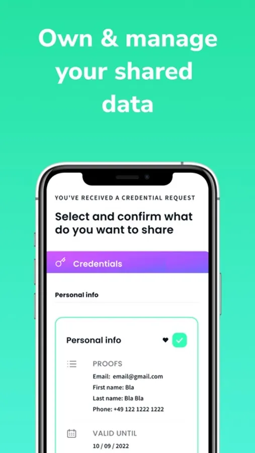 Your unique digital identity is created and stored inside your mobile when you download the app, so that you can exchange data through it: this means enhanced security, since no information is valid without being paired with your device, therefore providing implicit two-factor authentication.